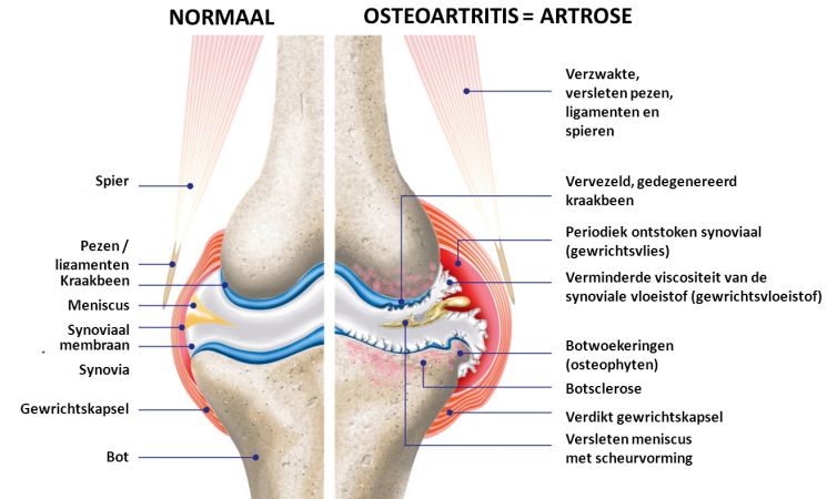 Op de rechter afbeelding ziet u een gewricht dat is aangetast door artrose. Bij artrose worden de kraakbeenkussentjes afgebroken. Na verloop van tijd gaan de botten over elkaar heen schuren.
